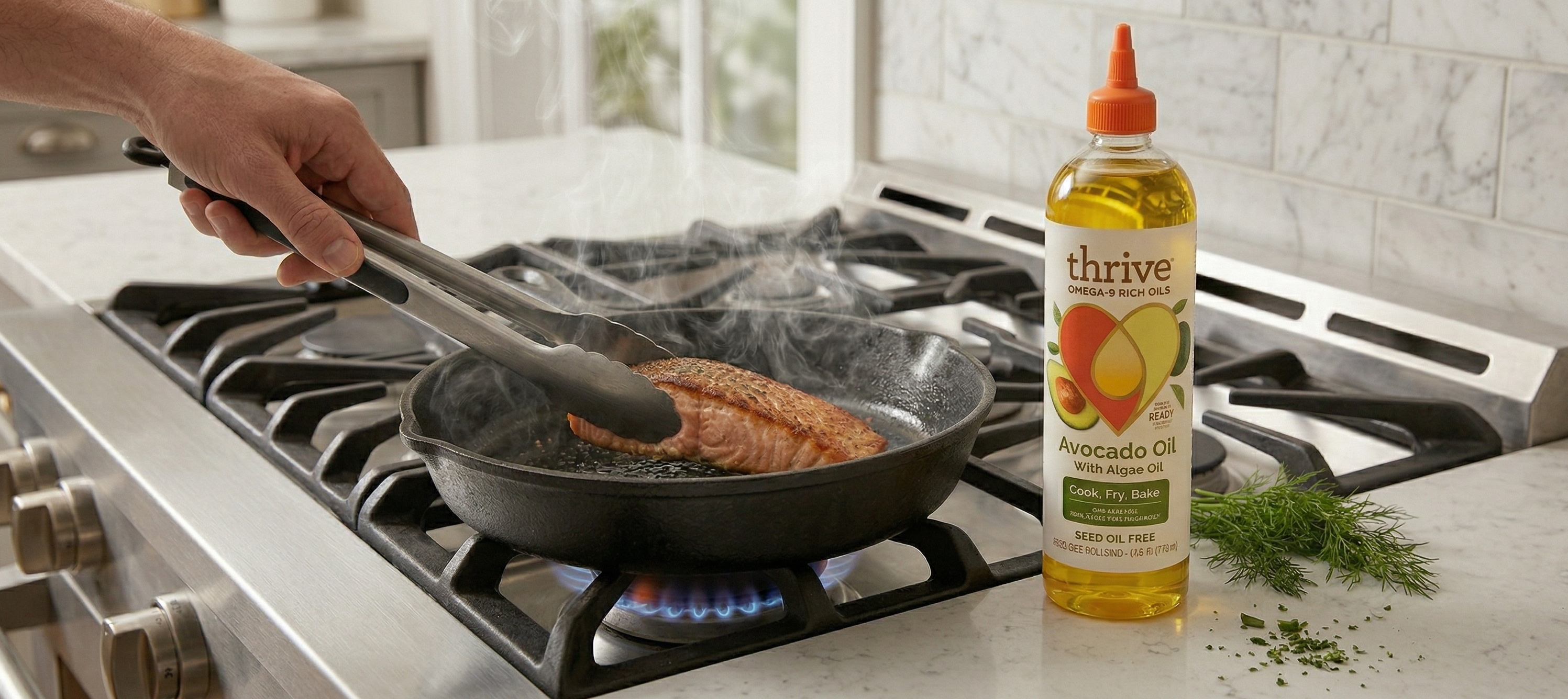 At Thrive we combine the heart-healthy benefits of monounsaturated fats (MUFAs) - the "good fats" that are found in Olive and Avocado Oils with our proprietary blend of Thrive Algae Oil. This provides the highest levels of MUFAs and enables the highest smoke points for healthy high-heat culinary adventures.